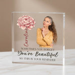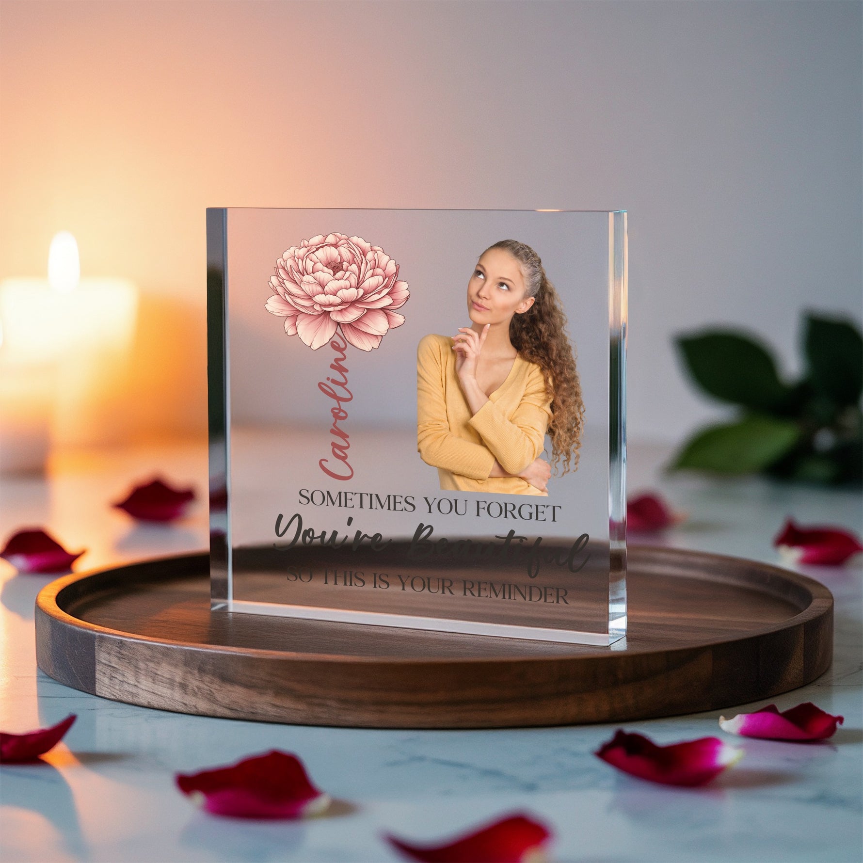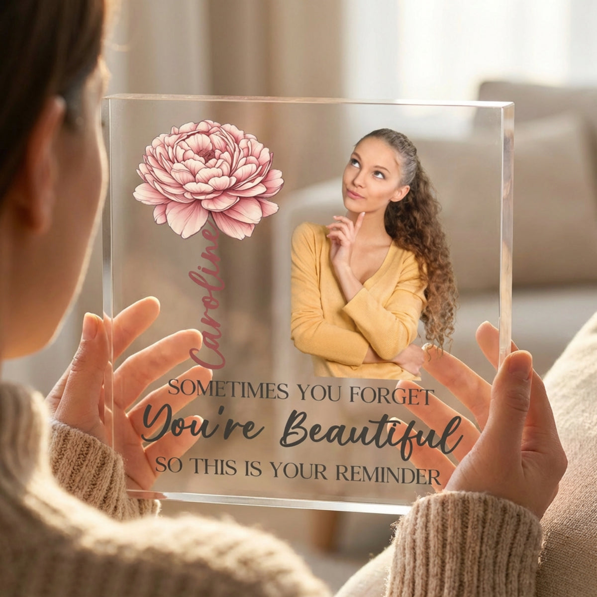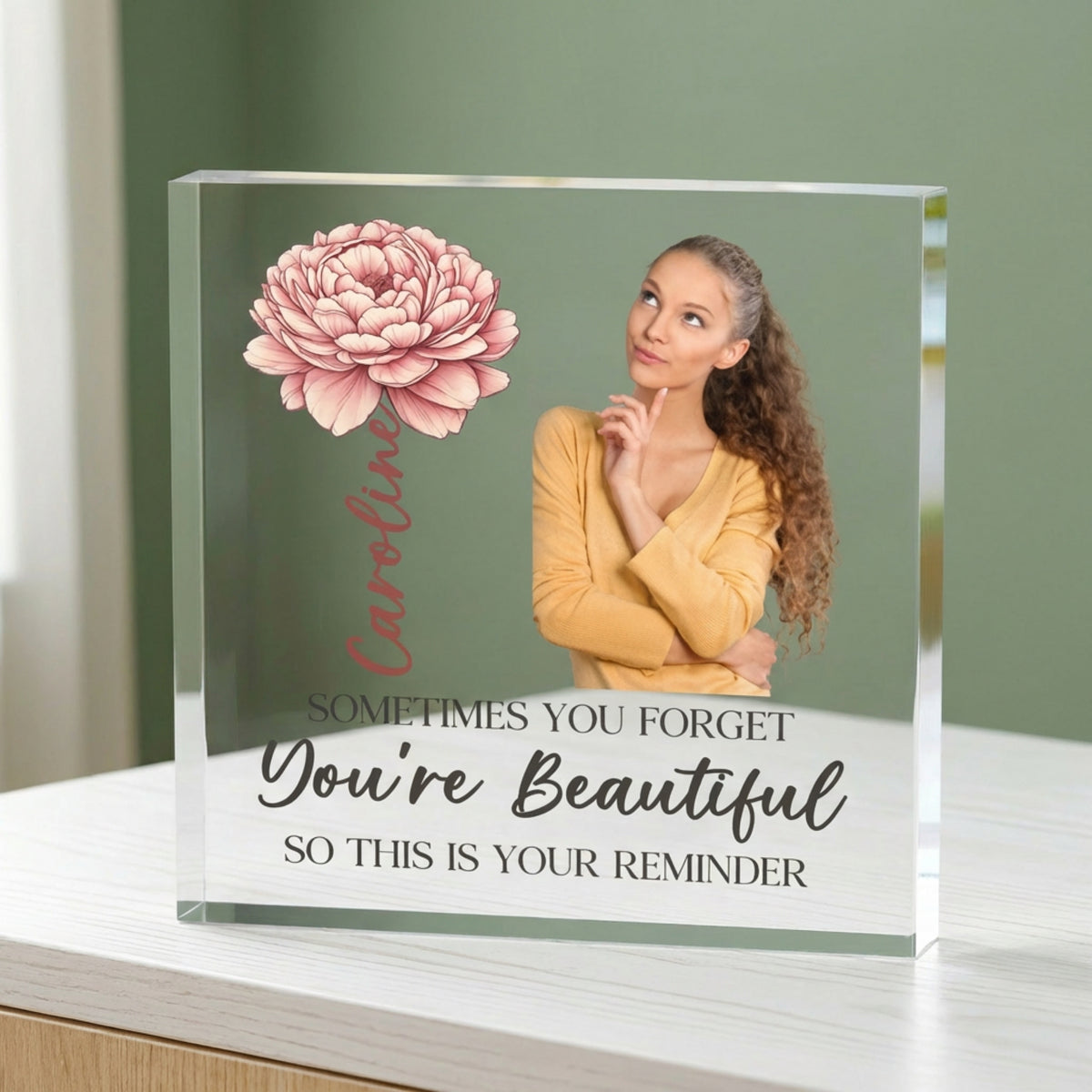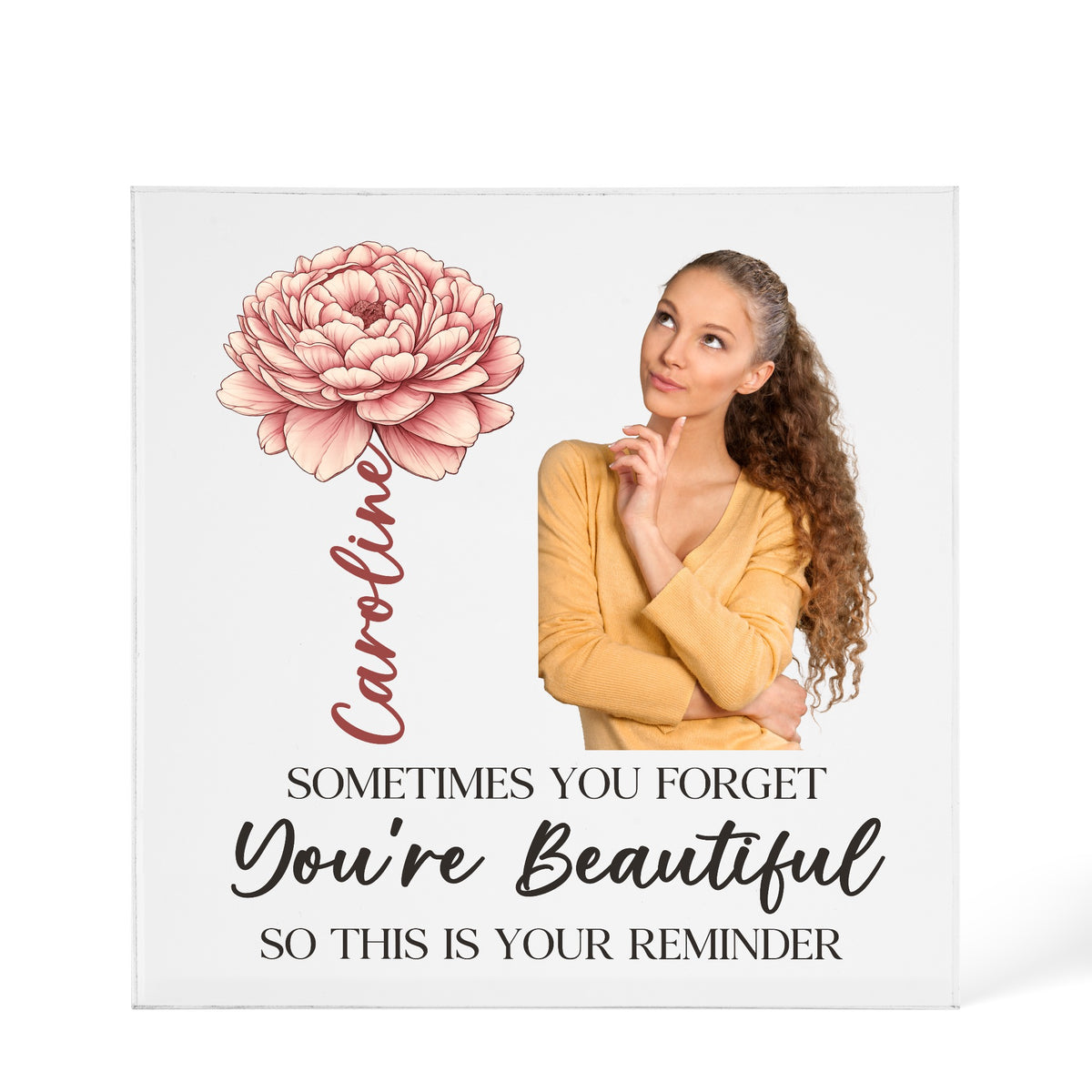 Featuring a beautiful floral design, a custom name, and your chosen photo, this plaque displays the uplifting message: “Sometimes you forget you’re beautiful, so this is your reminder.”