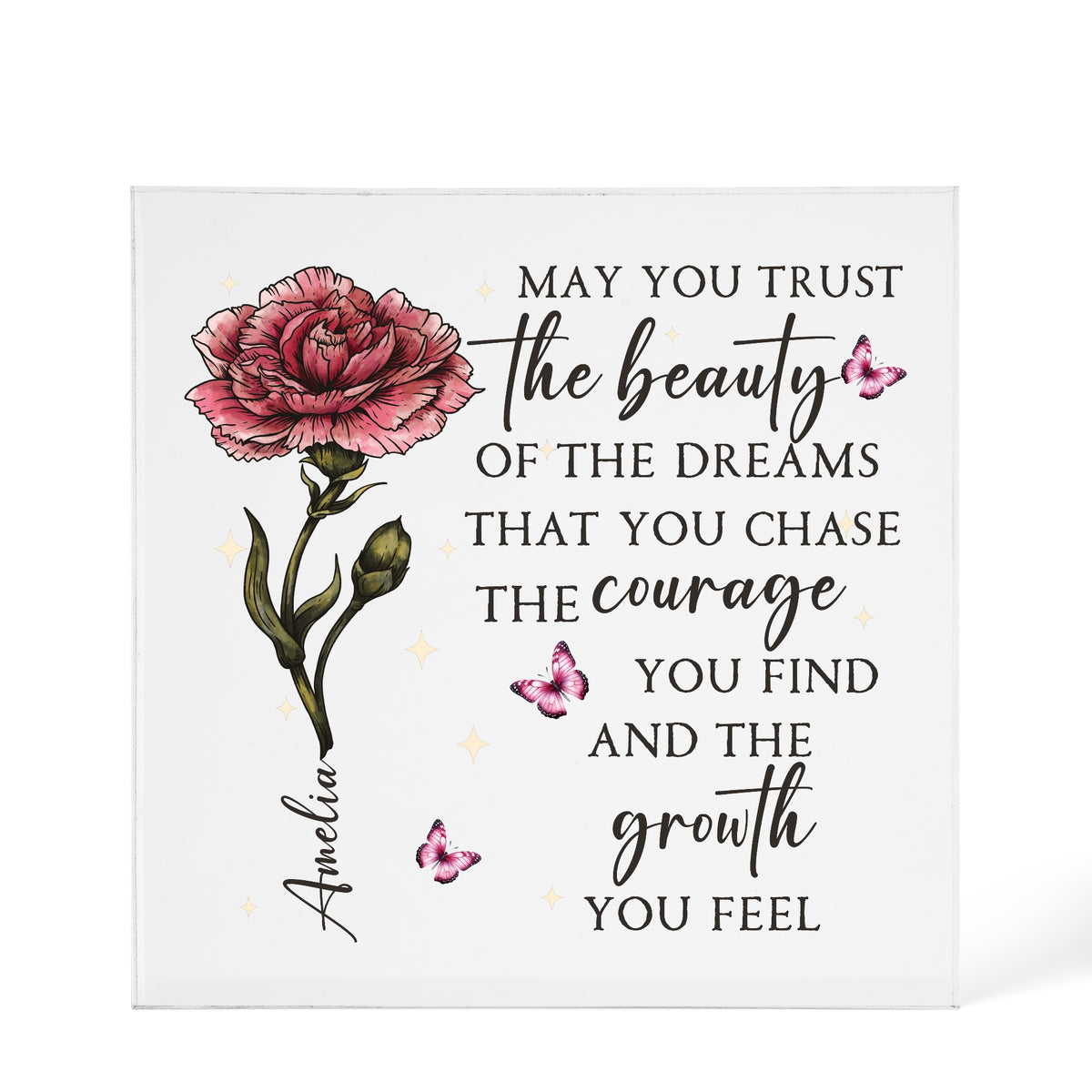 Featuring a beautiful floral illustration, delicate butterflies, and a powerful motivational quote, this plaque becomes even more meaningful with a custom name added for a personal touch.