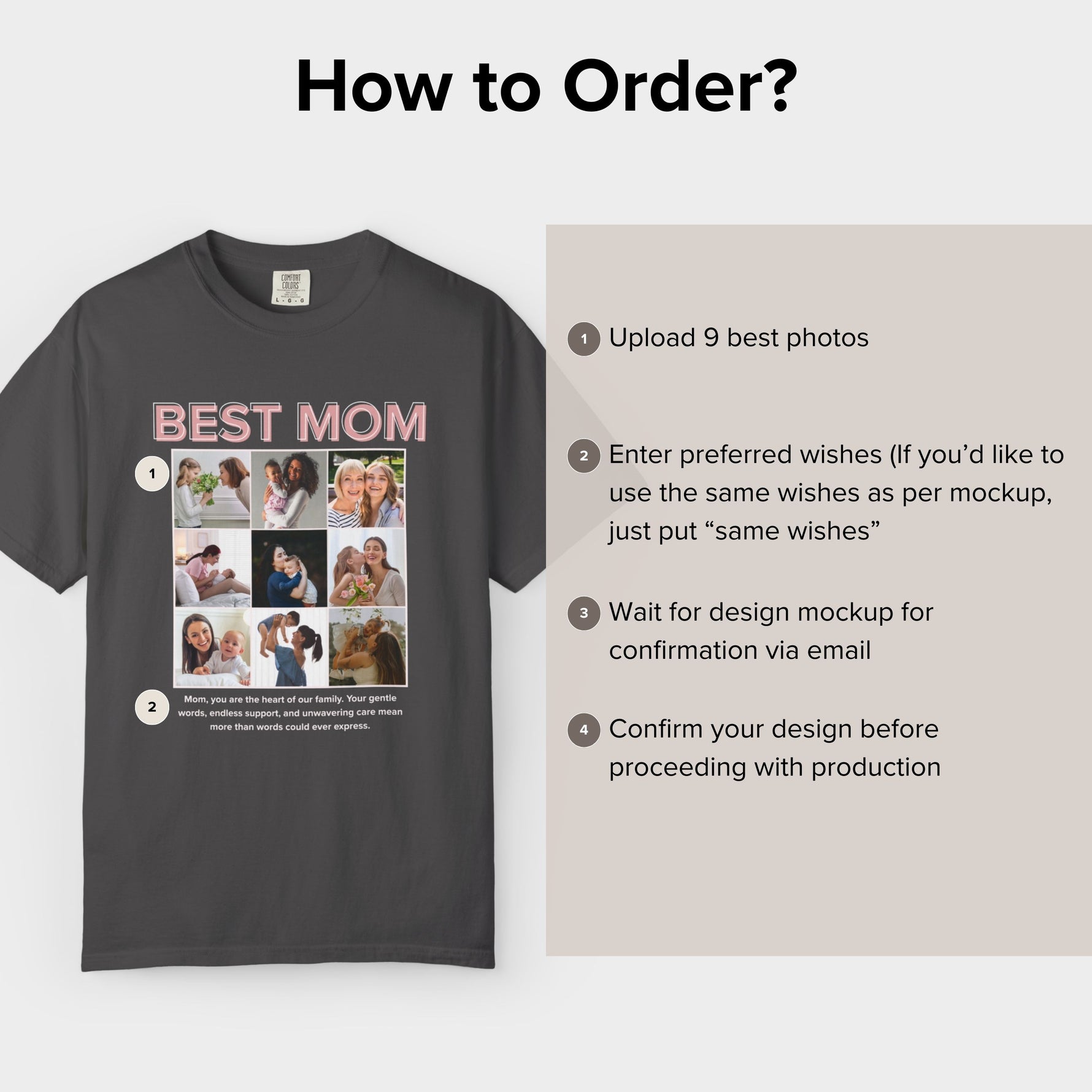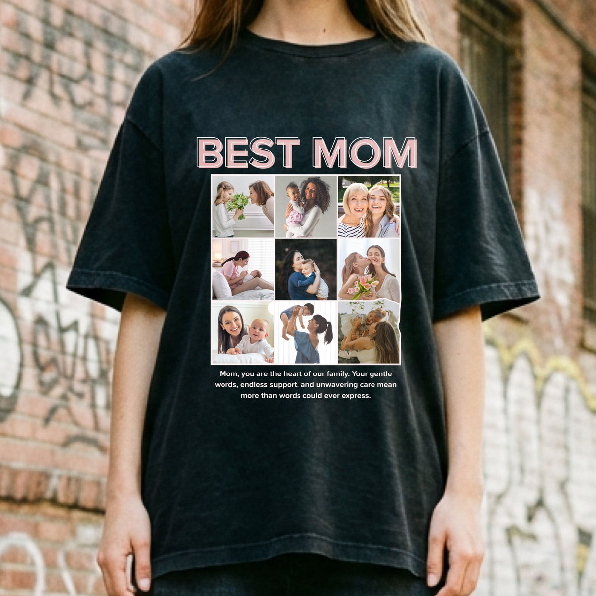 Celebrate the most important woman in your life with a personalized Best Mom photo collage shirt. This custom t-shirt features your favorite photos arranged in a beautiful collage design with a heartfelt message. A meaningful and emotional gift that mom can wear proudly. Perfect for Mother’s Day, birthdays, Christmas, or just to say thank you.