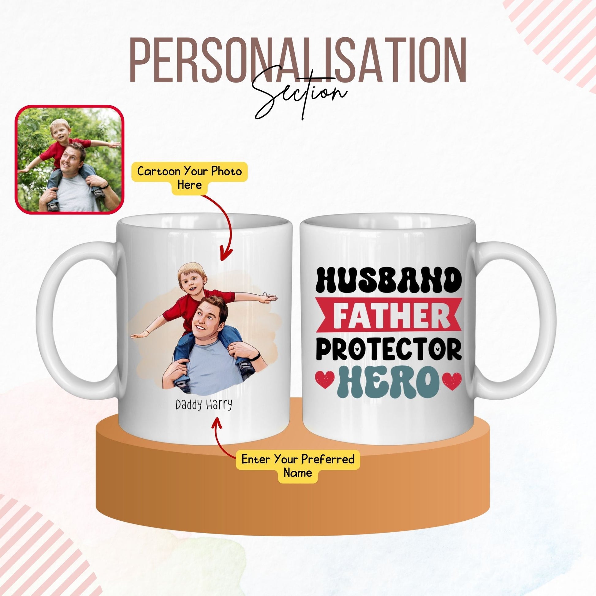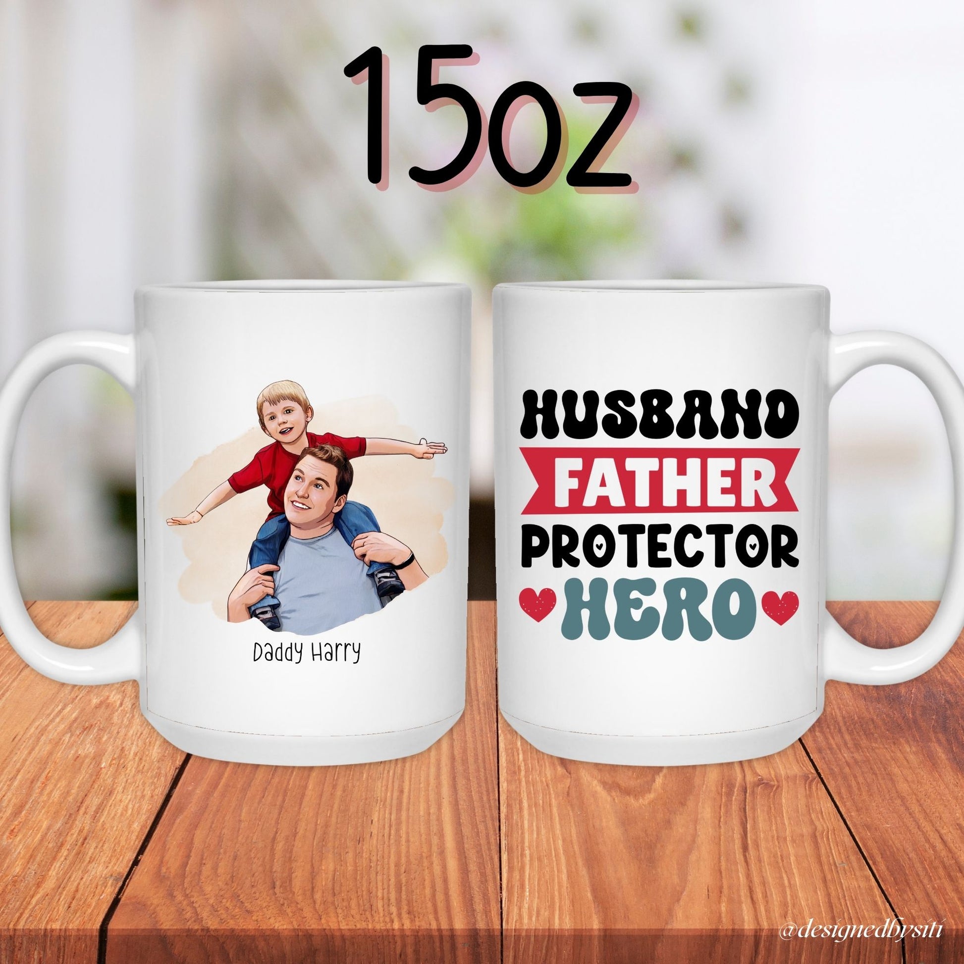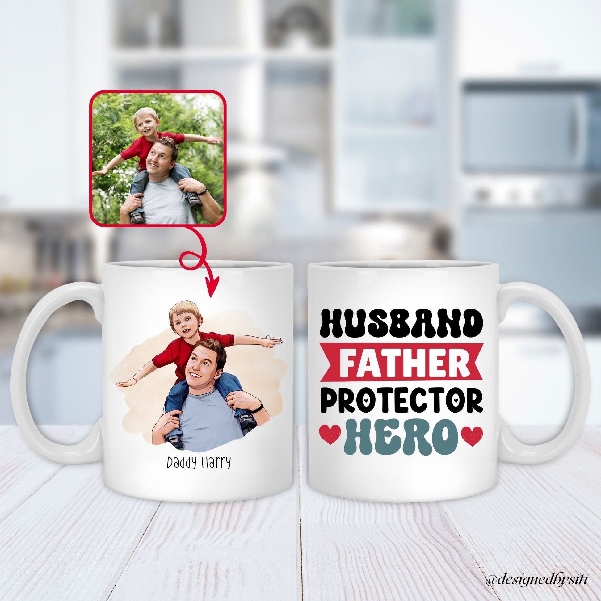 Transform your cherished photo into a personalized photo mug, creating a custom coffee cup that makes the perfect birthday gift for dad or thoughtful gift for your husband or father. This retro dad mug features a "Hero Father" theme, making it the ideal mug for dad that any best dad will love.